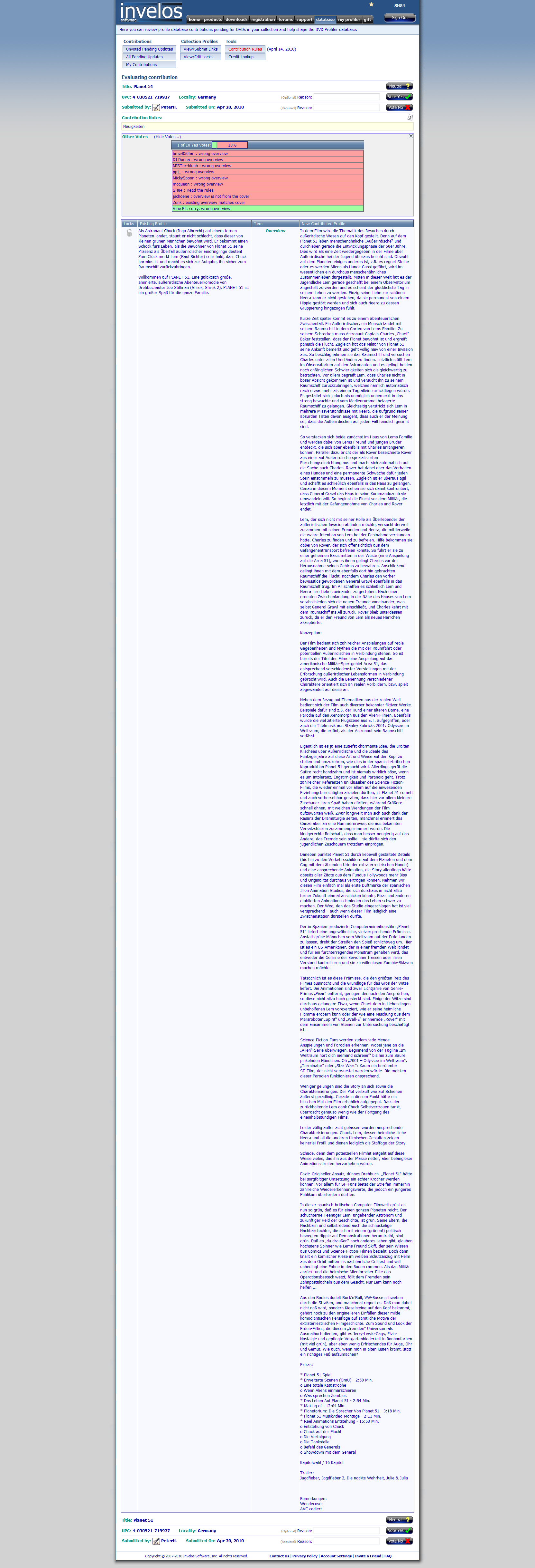 Hoffentlich geben die Screener die negativen Votes mal an Ken weiter. Wer weiß, welche Profile er noch ruiniert. Leider hat er ja 3000 DVDs...  |